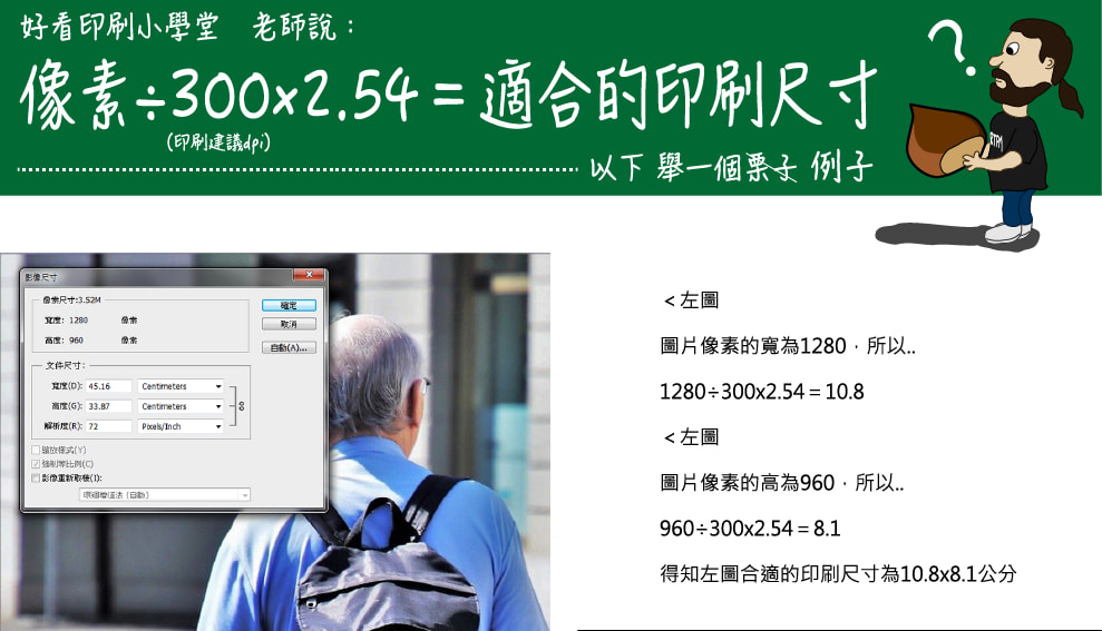 我們只要將圖片的像素的寬及高分別除以300dpi,便可得到圖片英寸的印刷尺寸,