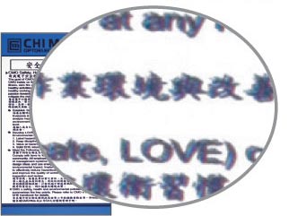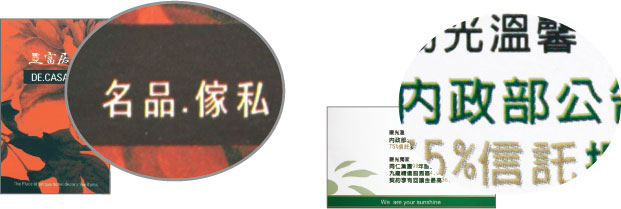 A:印刷後,因紙張伸縮的因素,在完稿文字的設定,若為七級以下,且為雙色以上或反白字的設定時,易發生套印不準的雙影問題,尤其為合成紙、珠光紙,如下圖。