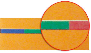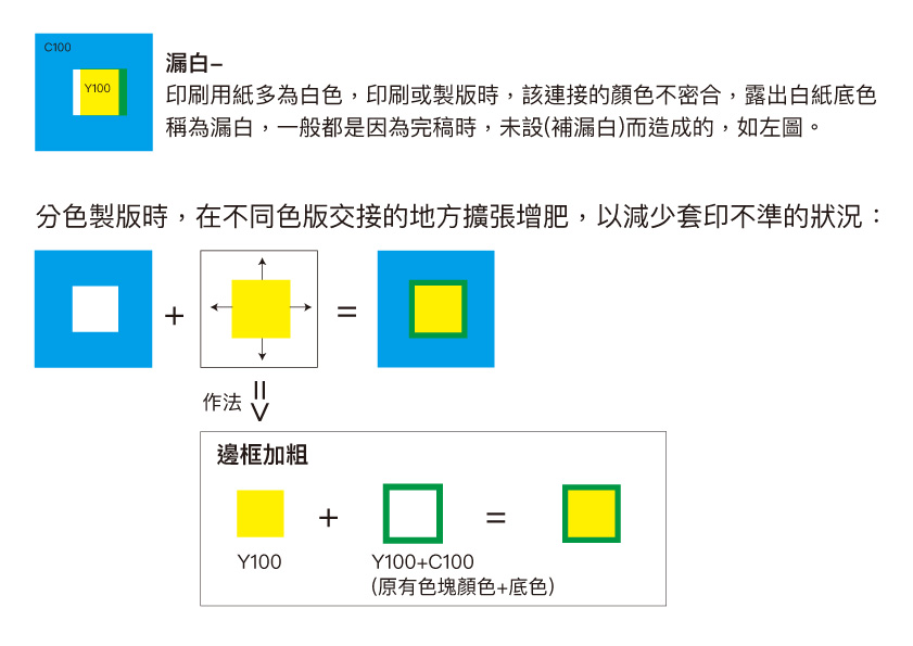 A:印刷是由 4塊色版(KCMY)套印出來的,在套印過程中,難免有無法100%精準對位的情況,此時,若設計製作完全不同色版且相鄰的大面積色塊,便可能因些微的對位不準而露出白色底色,稱為「漏白」,如下圖。