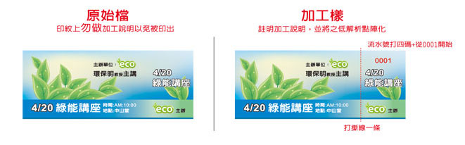 稿件說明請包括:流水號打幾碼及位置?流水號起始碼?撕線打幾條及位置?下圖右方為需加工的說明指示,左方則為正確要印刷的檔案。