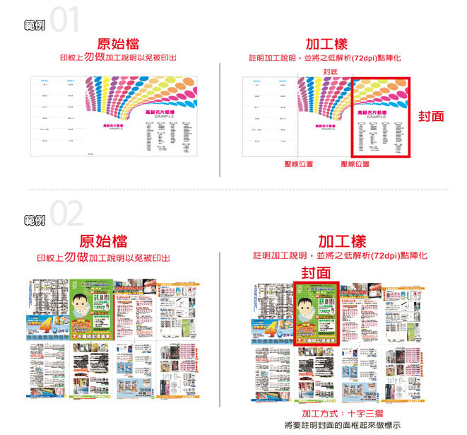 稿件說明請包括:封面、封底完成是在哪一面?摺紙、壓線的位置?下圖右方為需加工的說明指示,左方則為正確要印刷的檔案。