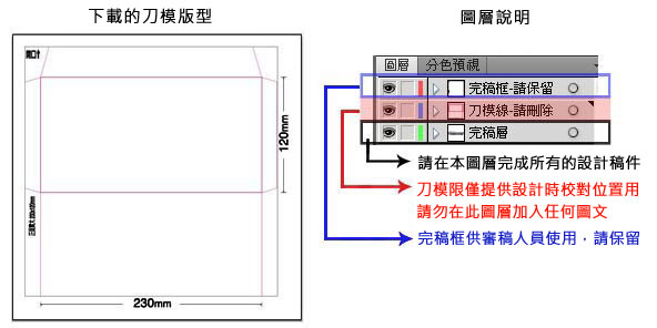 - 刀模檔案勿套印刷圖,印刷對位圖與刀模檔案要分開。