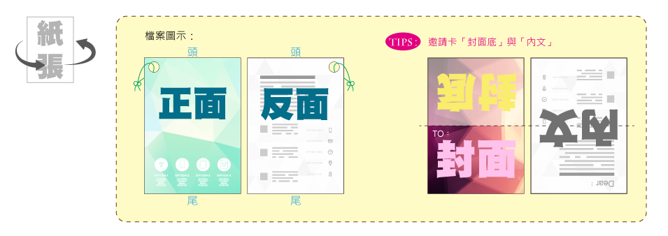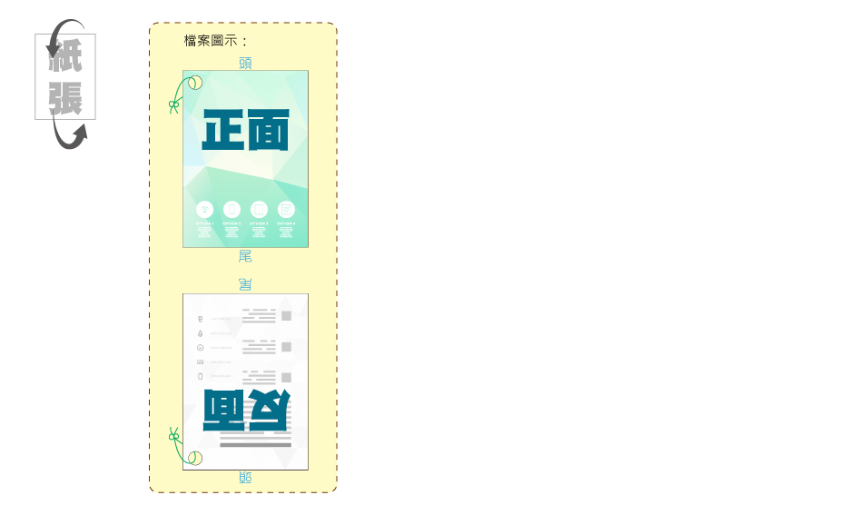 提示:可將正反面視為紙張「對摺」的兩邊,來對應稿件放置的位置與方向