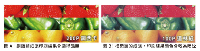 紙張,就是印刷的「被印物質」,每種紙張本身的質地不同,有的顯得光滑亮麗、有的則為樸拙沒有光澤感。所以即使運用相同的圖檔印刷,也會因為選用的紙張,本身吸收油墨多寡的特性不同或紙張顏色不同 ,而有不同的顯色效果