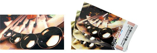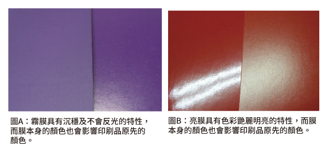常見印刷品有做「上光」處理,上光指的是在印刷品上方附上一層薄膜而稱之。而這層薄膜的效果常見的 為「亮膜」或「霧膜」,薄膜本身有顏色、且有厚度之分,當覆蓋在印刷品上時,就會影響下方印刷品原 先所顯現的顏色。 如下圖,可以充分看出上光前後的顏色差別