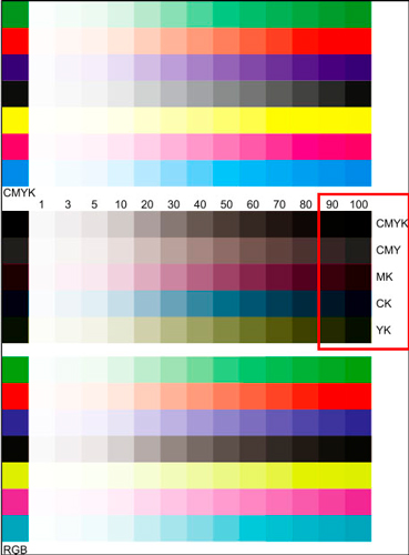 - 例如CMY100、CK100、MK100、YK100 雖然都有 K100 ,印樣卻不黑,便是因為其他顏色的色版疊印的結果。如需印出純黑,請將色塊調成k100。