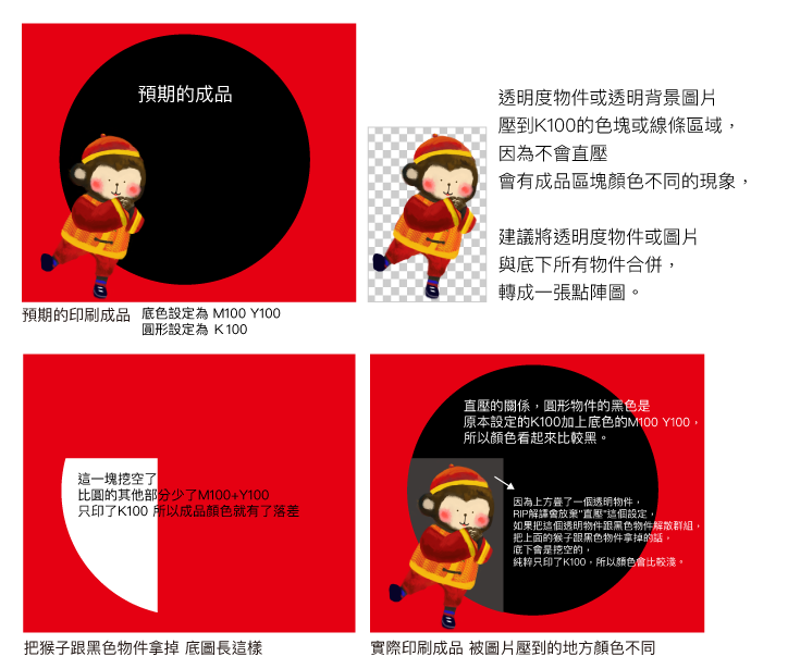 - 填色K100的色塊或線條,皆為黑色直壓,不能襯有其他顏色,以免造成疊印。如要避免直壓填色請設C1M1Y1K100或K99。