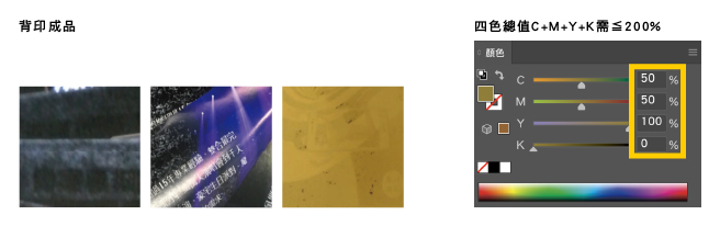 - 設計時階調總值請勿超過200%以上的填色。尤其是RGB轉CMYK時黑色的部份易形成四色套印,若階調總值過大時需利用Photoshop影像軟體特別處理。