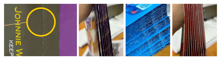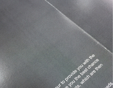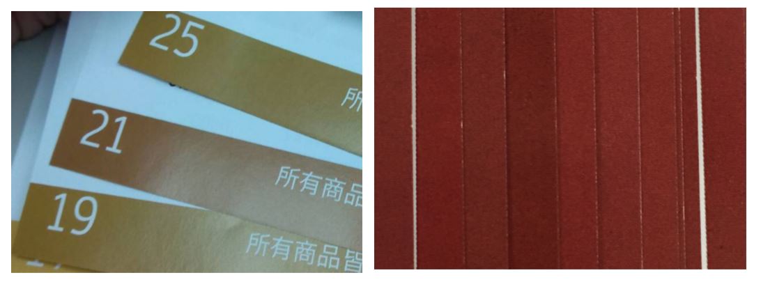 A.軋型或裁切的邊緣易露白。印刷成品若是滿版、深色時,由於與紙張白色纖維的對比明顯,易在裁切及軋型邊緣看出紙張纖維撕裂。