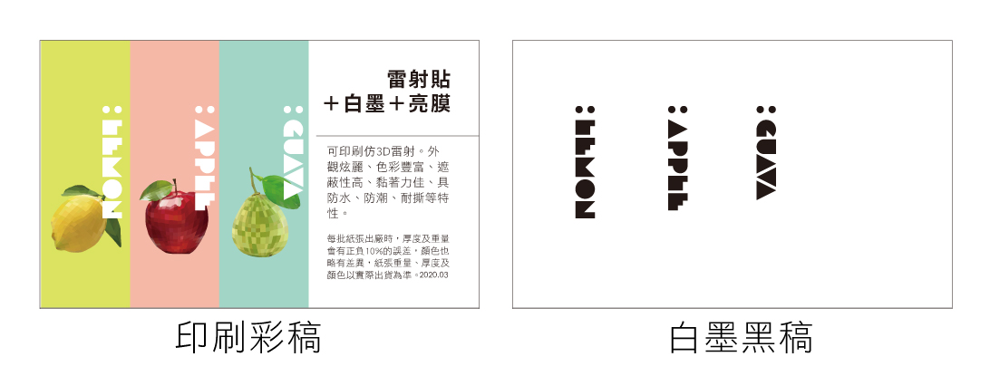例如: 萊妮、安格、象牙、頂象牙、道林等紙張因無塗佈處理,印刷後的顏色顏色顯得收斂、樸拙;而塑料材質 如合成、全透、霧透、珠光貼、透明貼、靜電貼、透明資料夾等材質適性,墨色會較為暗沈,如需較亮色彩 ,請自行調整案顏色。