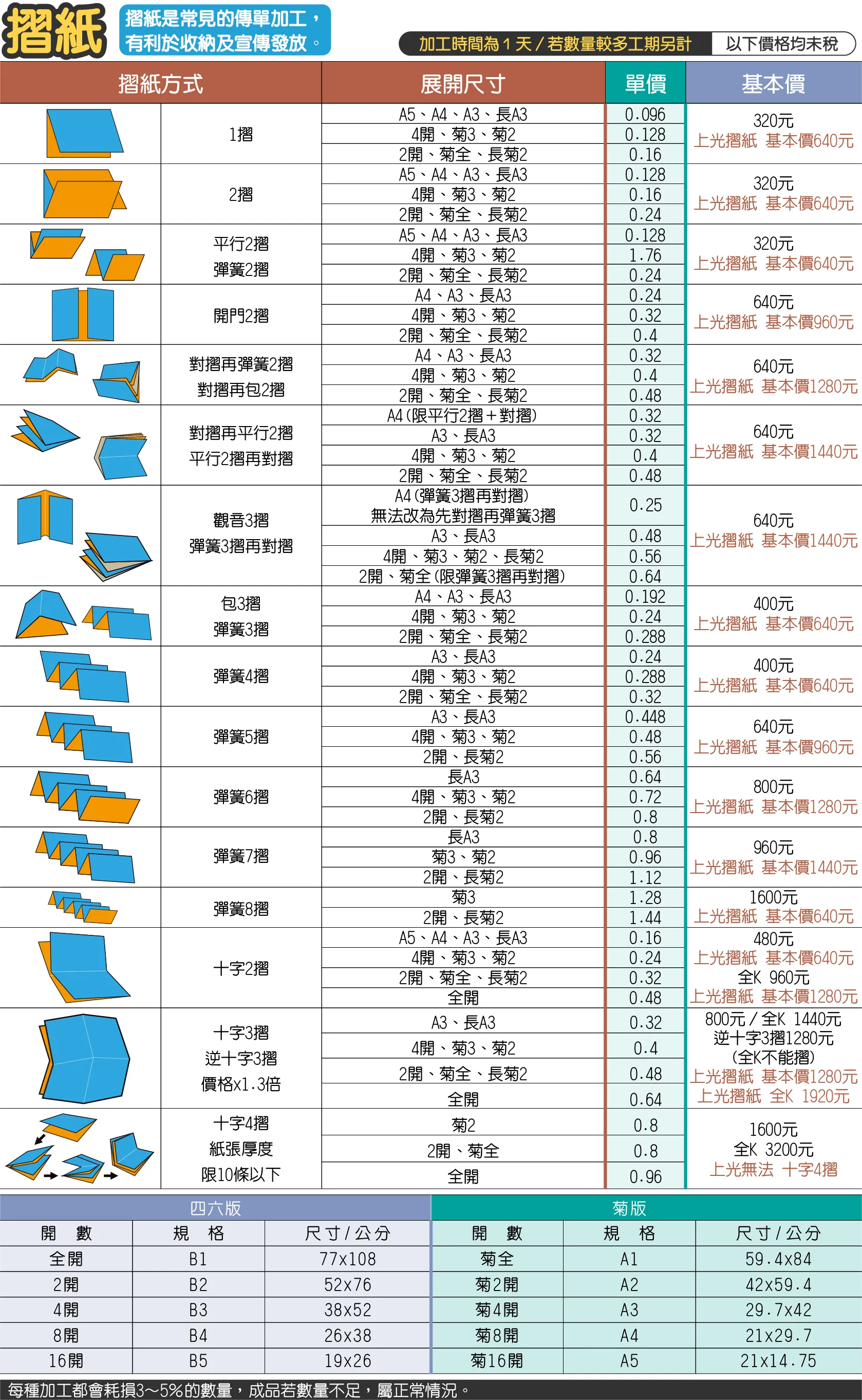 - 小於表定尺寸請參考特殊小尺寸摺紙價格。