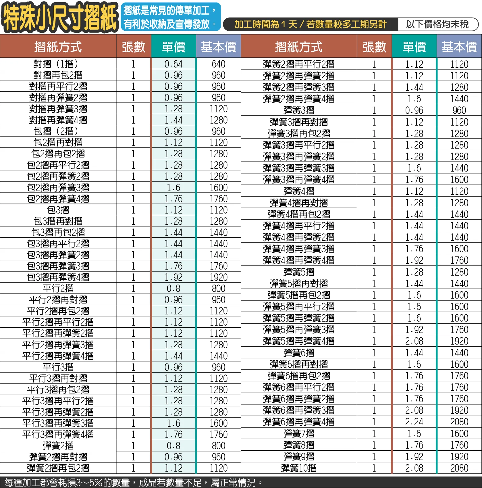 - 若摺紙費用未達基本價,將以基本價計,例如(1摺,A4尺寸,數量1000張,總計為0.06×1000=60元),將以基本價200元計。