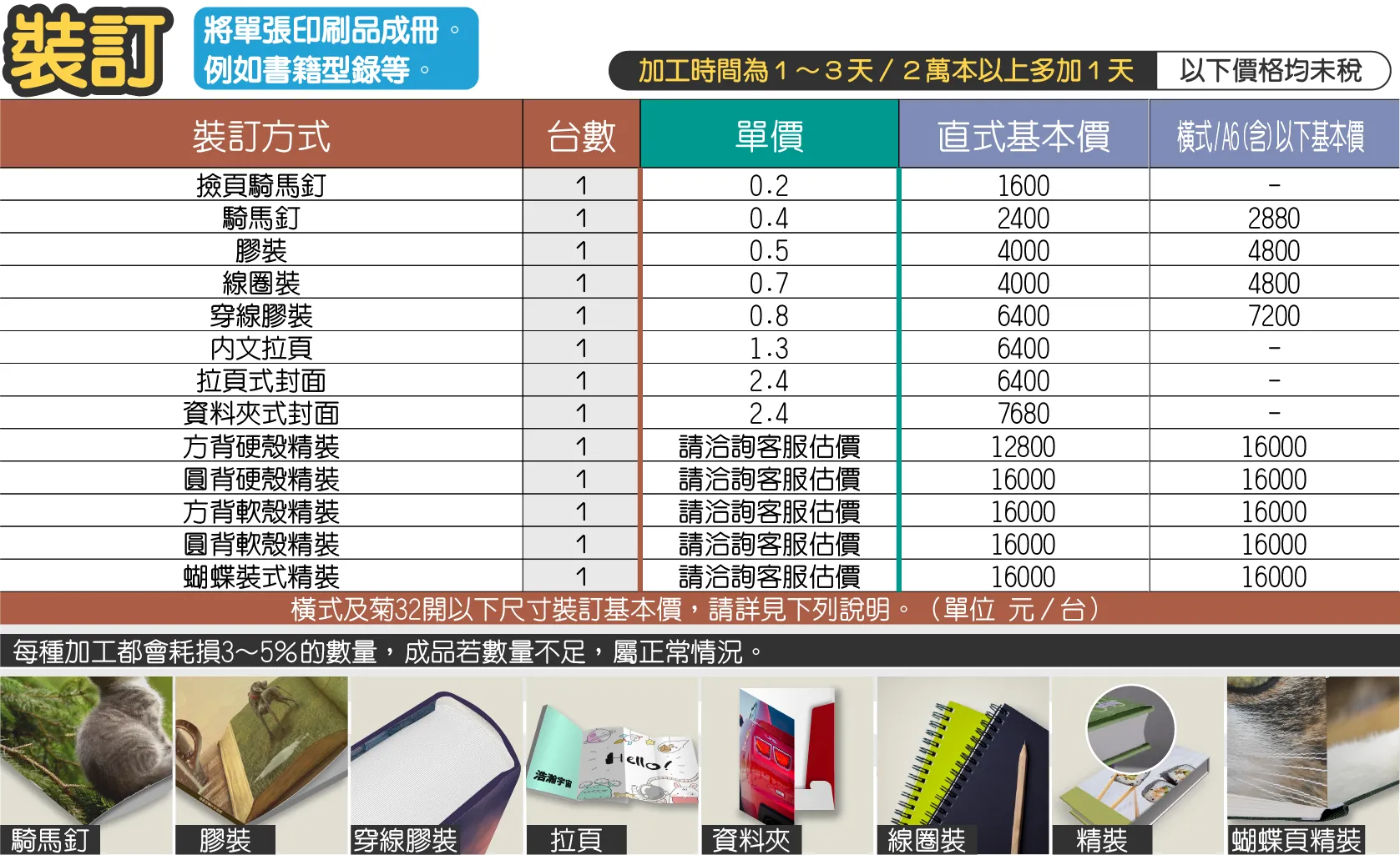 - 橫式及成品尺寸直A6(不含)以下尺寸裝訂,每台裝訂價格為單價兩倍;騎馬釘基本價2000元,膠裝基本價3800元,穿線膠裝基本價4800元。