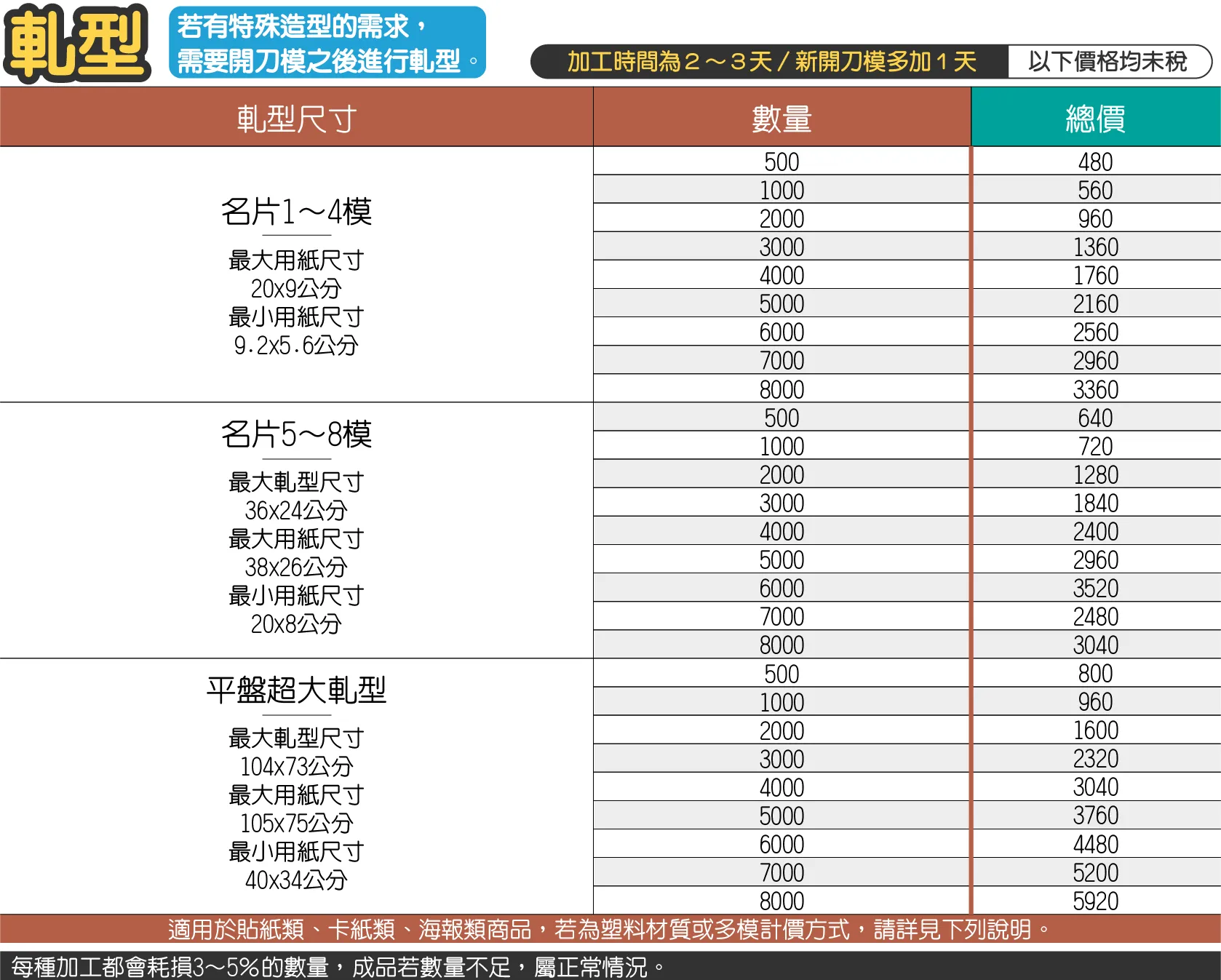 例如製作12模的刀模,軋型1000張時,計價方式為;800+4(12模-8模)x0.05×1000張=1000元(軋型費) - 超大軋型如需24×36公分以上至40×34公分以下,每1000張800元,基本價800元,其餘非列表尺寸,1張1.2元,基本價1000元。