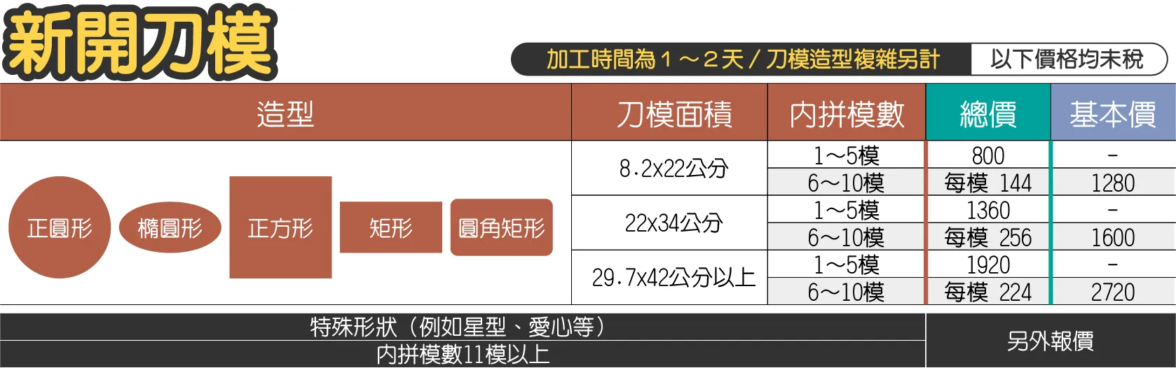 - 新開刀模的報價會因為造型複雜度及模數影響價格。例如:在22×34公分的紙張裡,製作橢圓形10模。
