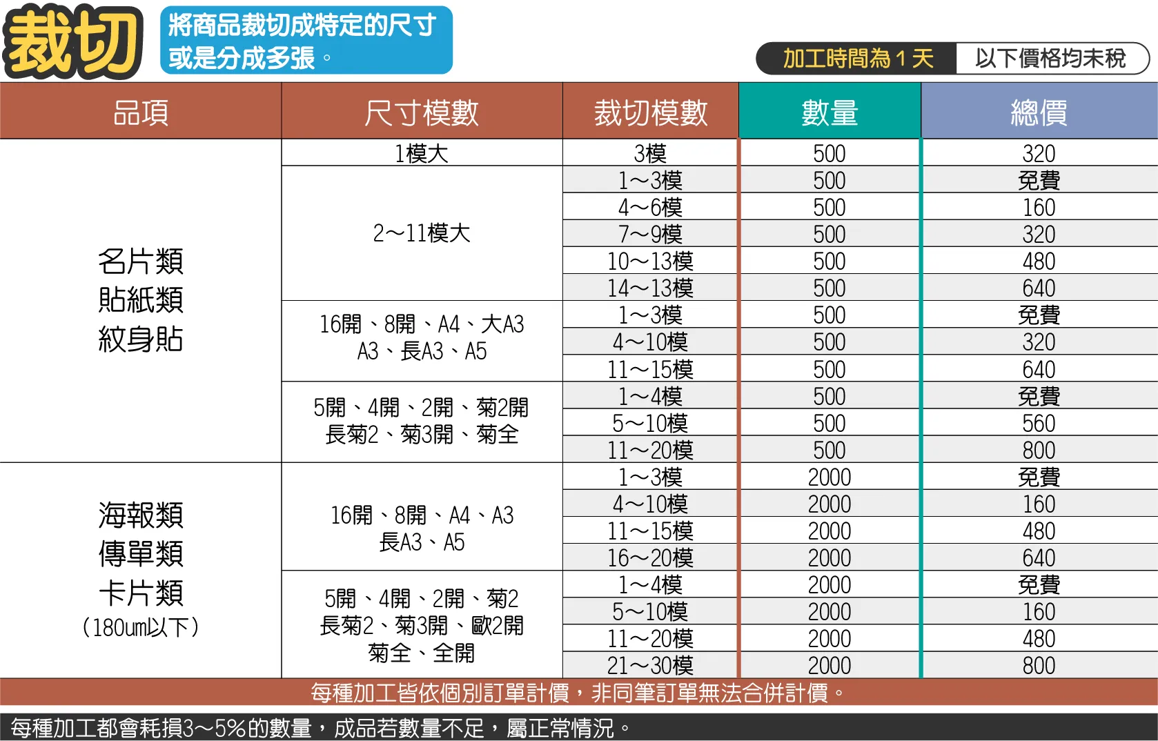 - 裁切小張,成品尺寸單模小於1才,費用另計。