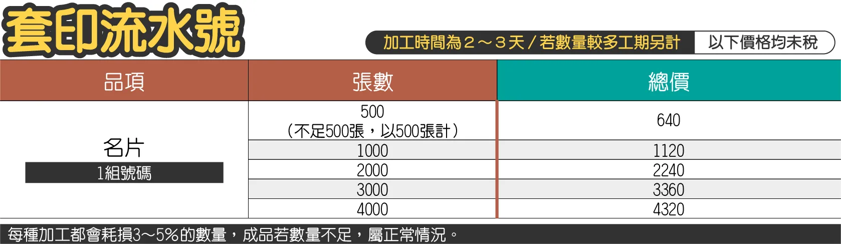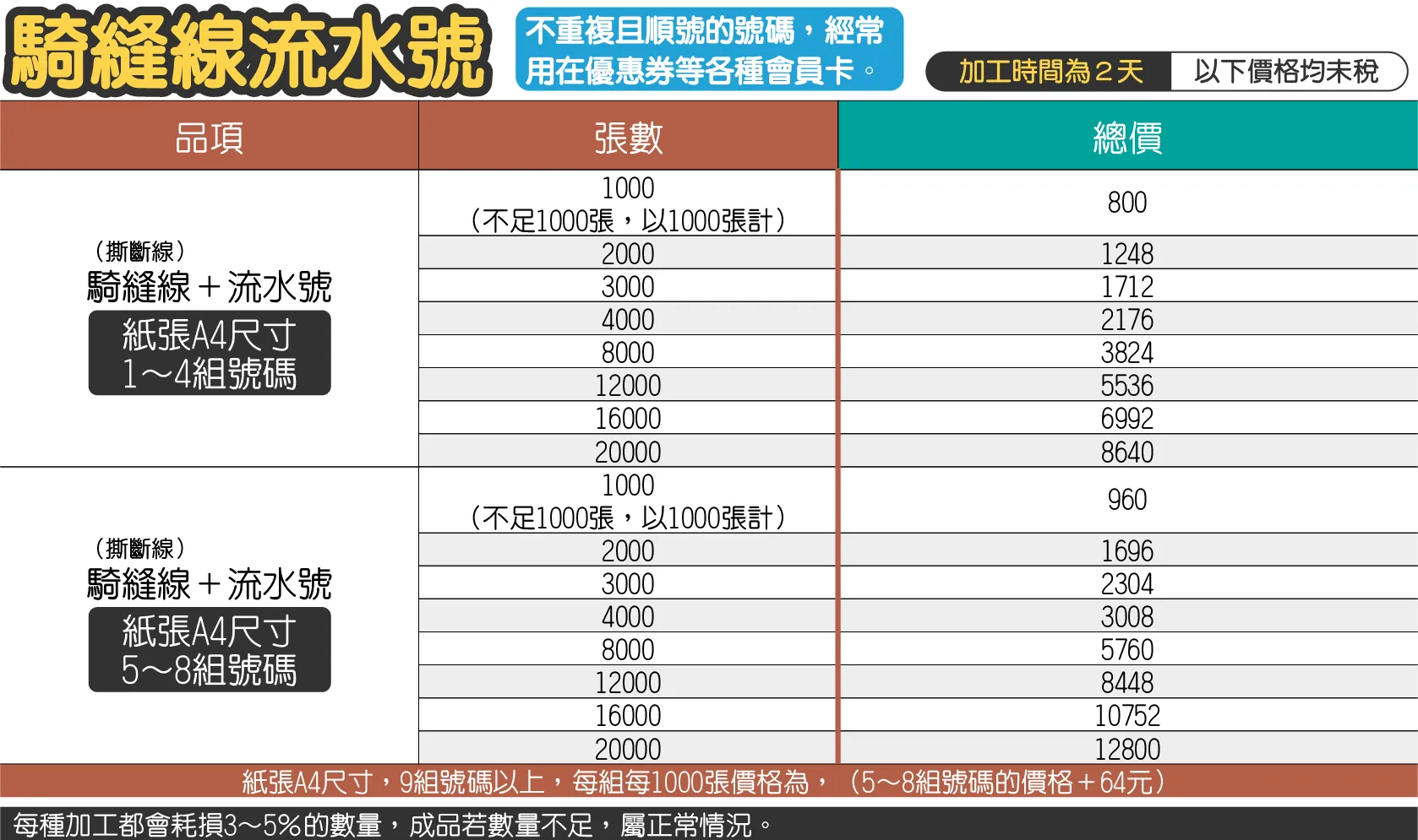 加工總計:384+320+960=1664元 - 糊頭或打釘加工另外再加流水號加工時,請另外加流水號加工的價格。(流水號加工,會耗損3~5%的印刷數量,於下單時可備註需加購放數)