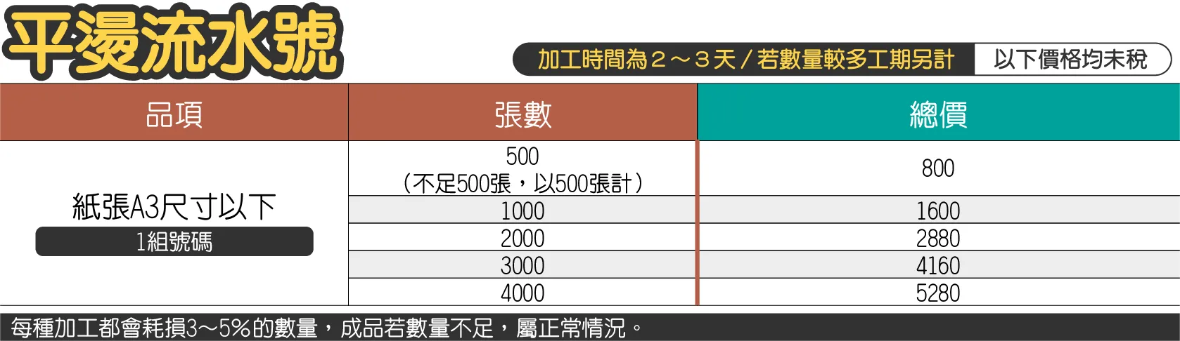 - 紙張非A3尺寸以下、兩組流水號、3D名片、貼紙,以上商品如需平燙流水號,請洽詢估價。