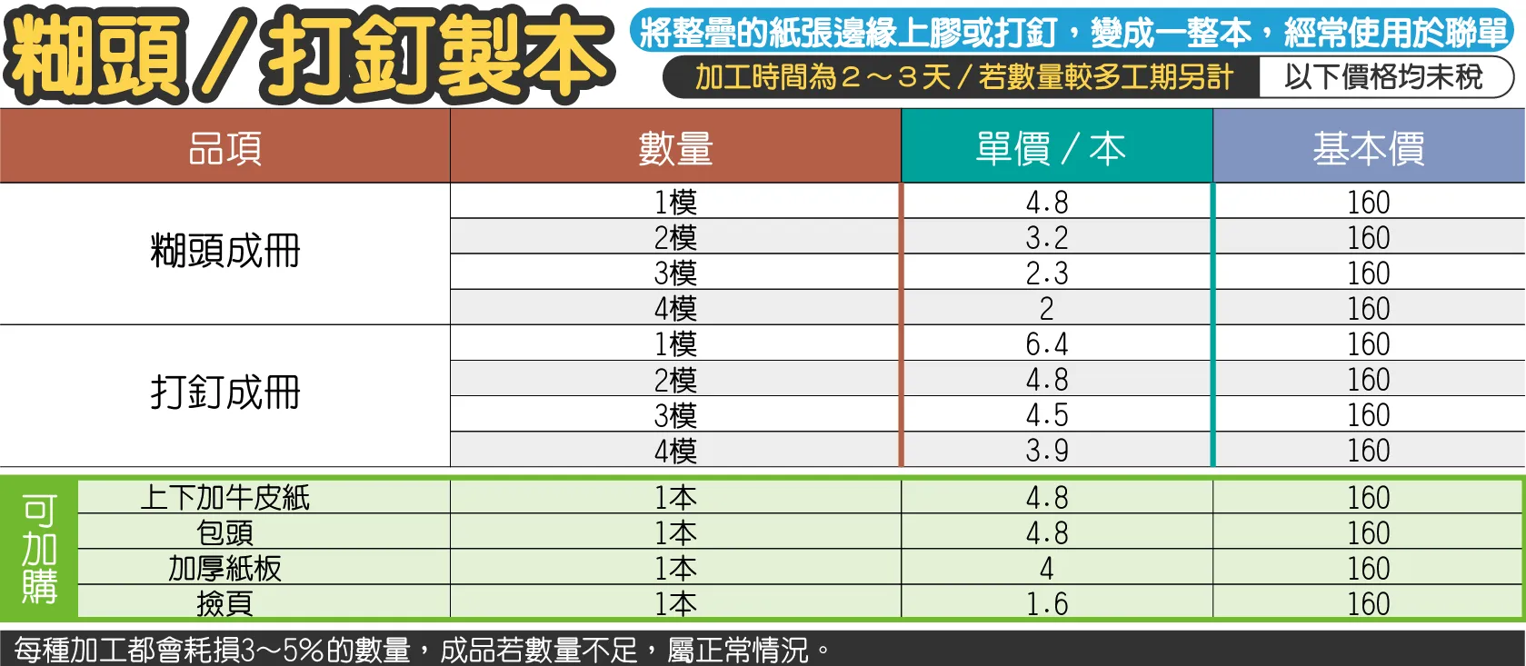 - 若需要另外做,(糊頭或打釘)加工成冊時,請參考糊頭或打釘價格計費。