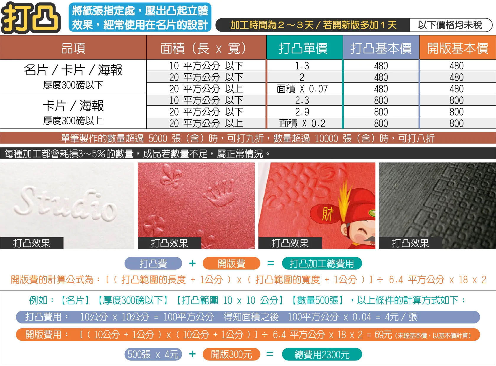 - 長寬計算皆為無條件進位,打凸版可由本公司保管,如需索取請於下單時備註。