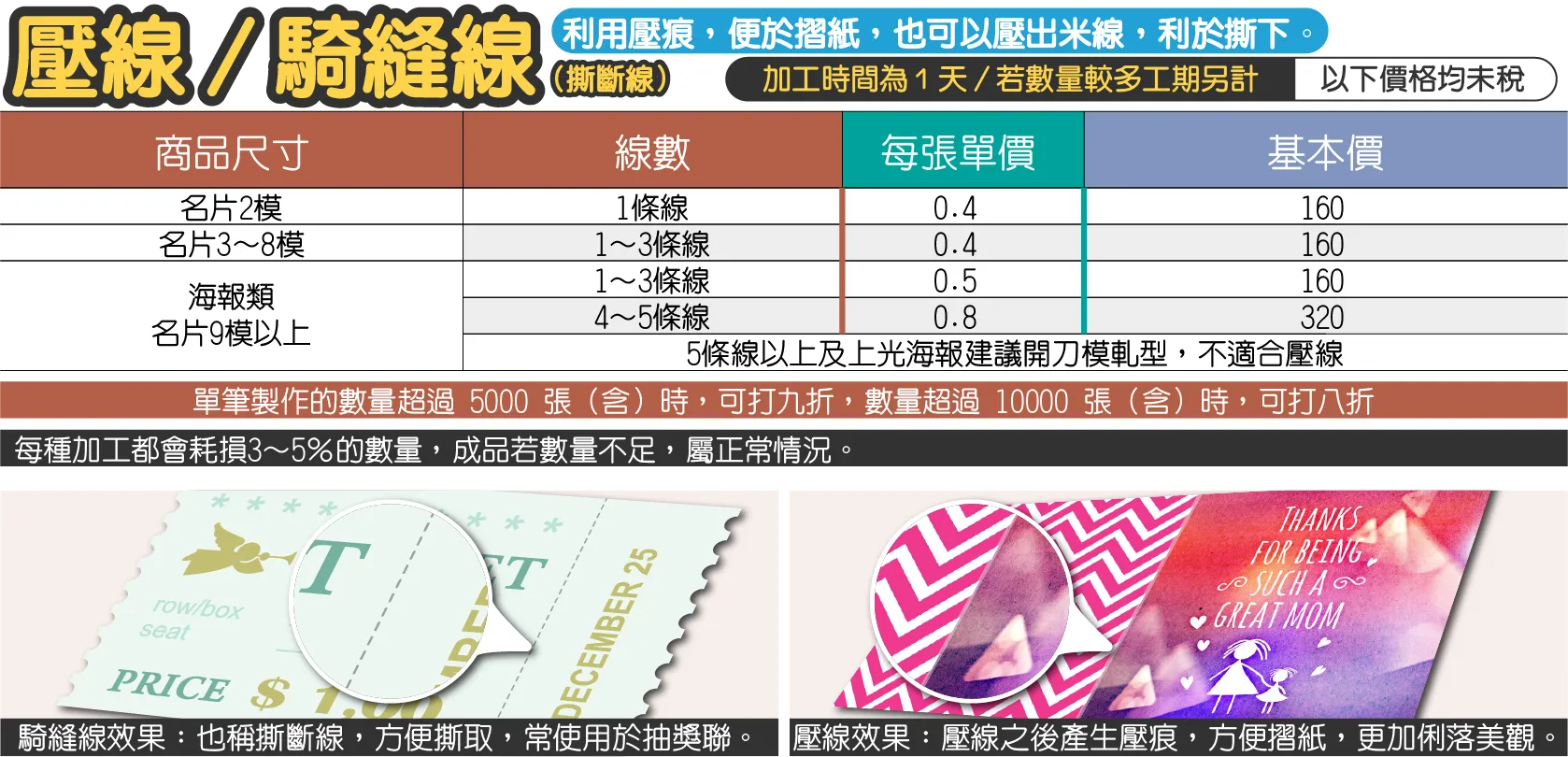 - 以上的加工價格為平行線,若為垂直線時,則以2次加工計算。且2次(含2次)以上的加工,易有偏移情況,建議另開刀模軋型,另外線數在6條以上時,也建議開刀模軋型。