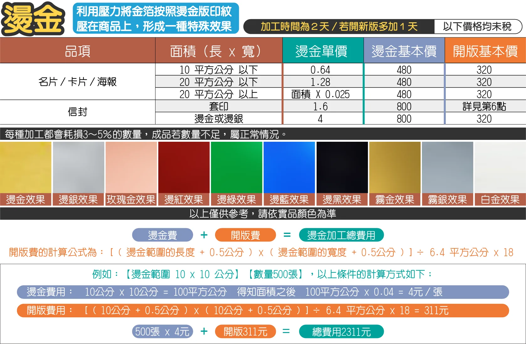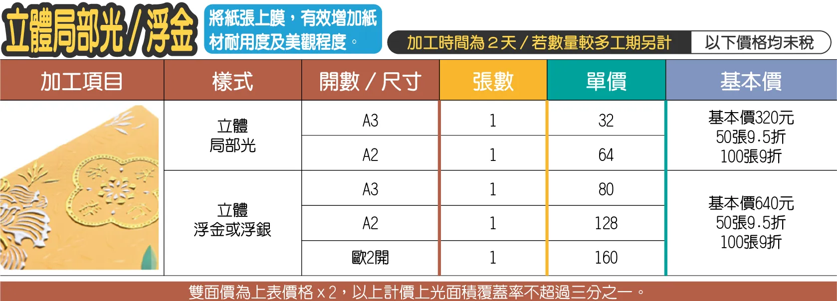 - 上光後(亮面霧面等)的商品如需燙金加工時,依價目表乘以1.3倍計算,基本價為500元。