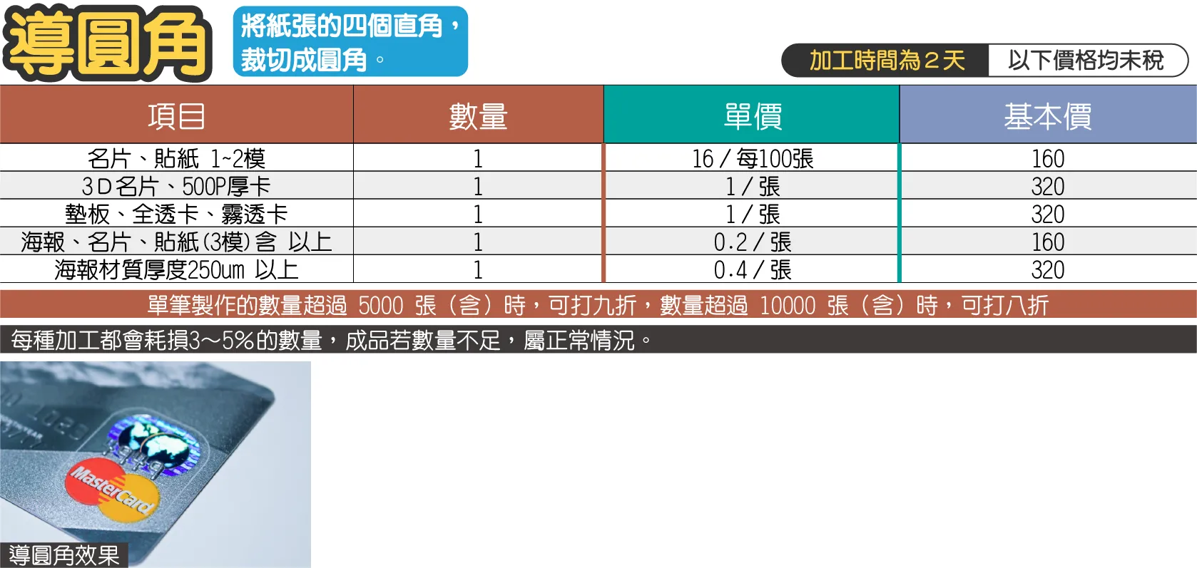 - 導圓角多款合併計價的定義為,同品商品(如名片、貼紙等),圓角直徑相同,同樣材質、數量、尺寸、同一筆訂單),導圓角加工可合併計價。