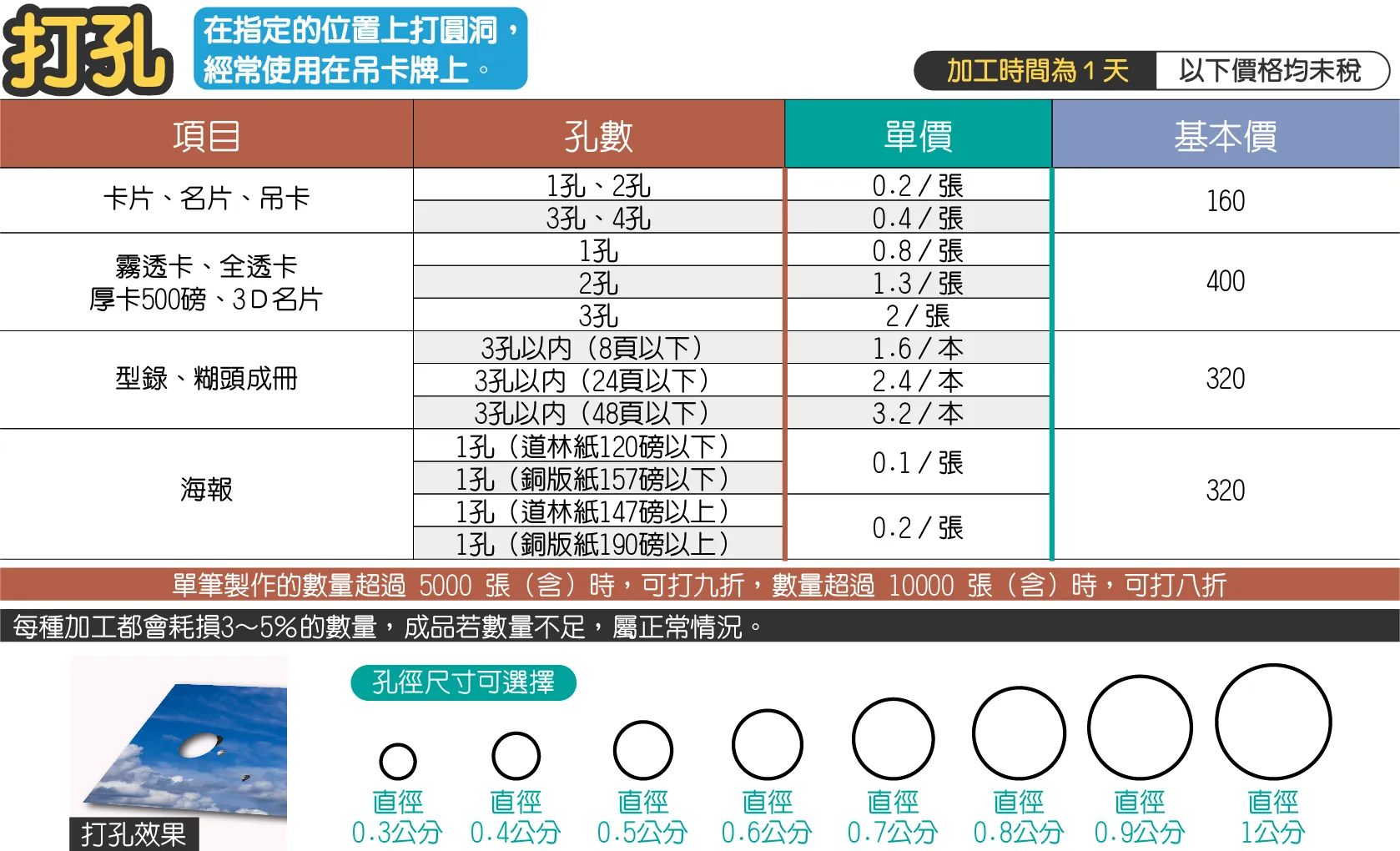 - 打孔加工,孔徑可選擇(直徑0.3、0.4、0.5、0.6、0.7、0.8、0.9、1公分)七種,發稿時請註明直徑,若無註明預設為直徑0.5公分。
