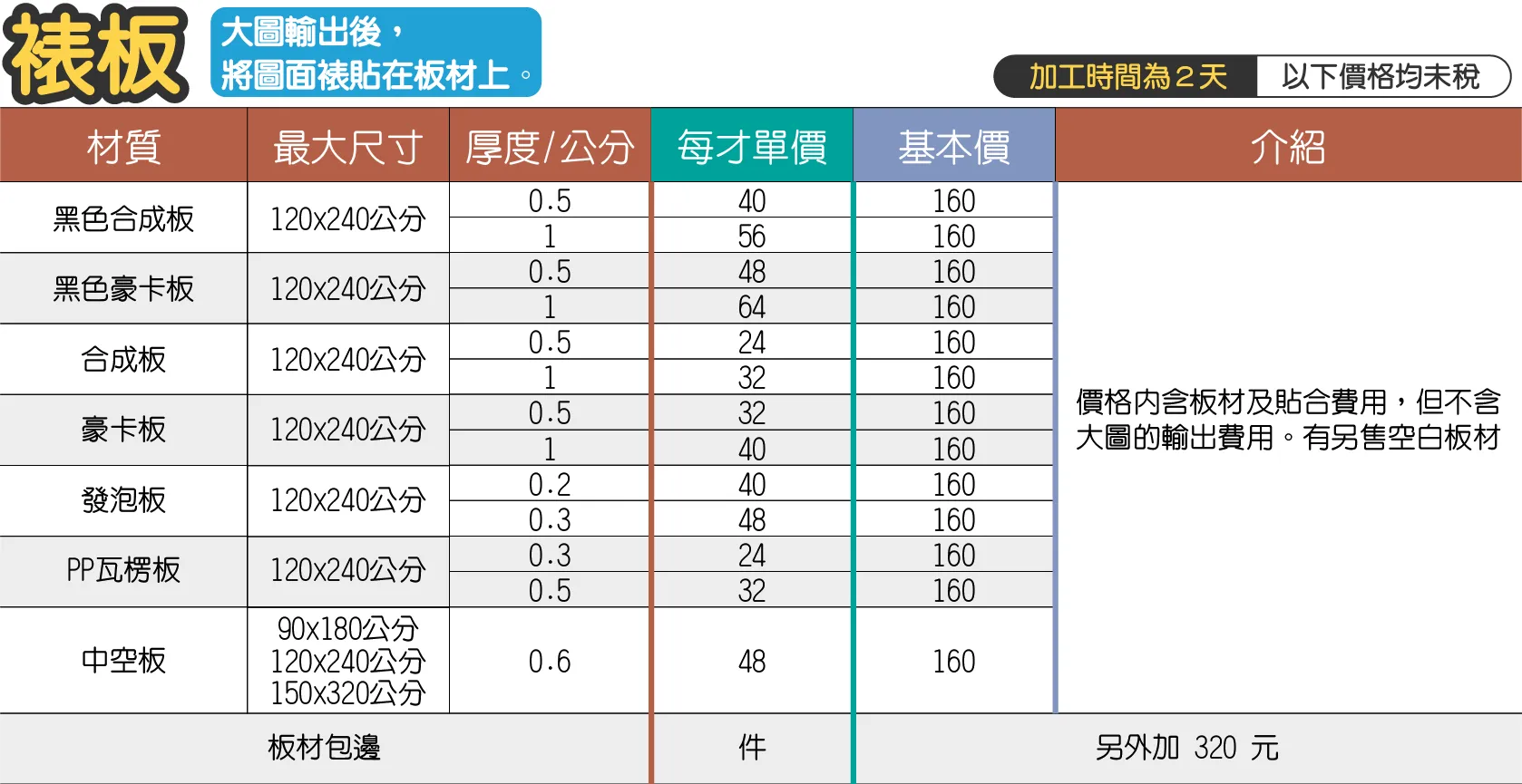 - 價格內含板材及貼合費用,但不含大圖輸出費用。