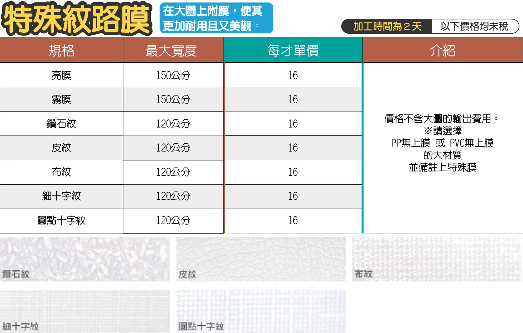 - 海報類、傳單類、名片類,厚度200磅以上及厚度147磅雙面上膜的材質,依價目表乘以1.5倍計價。