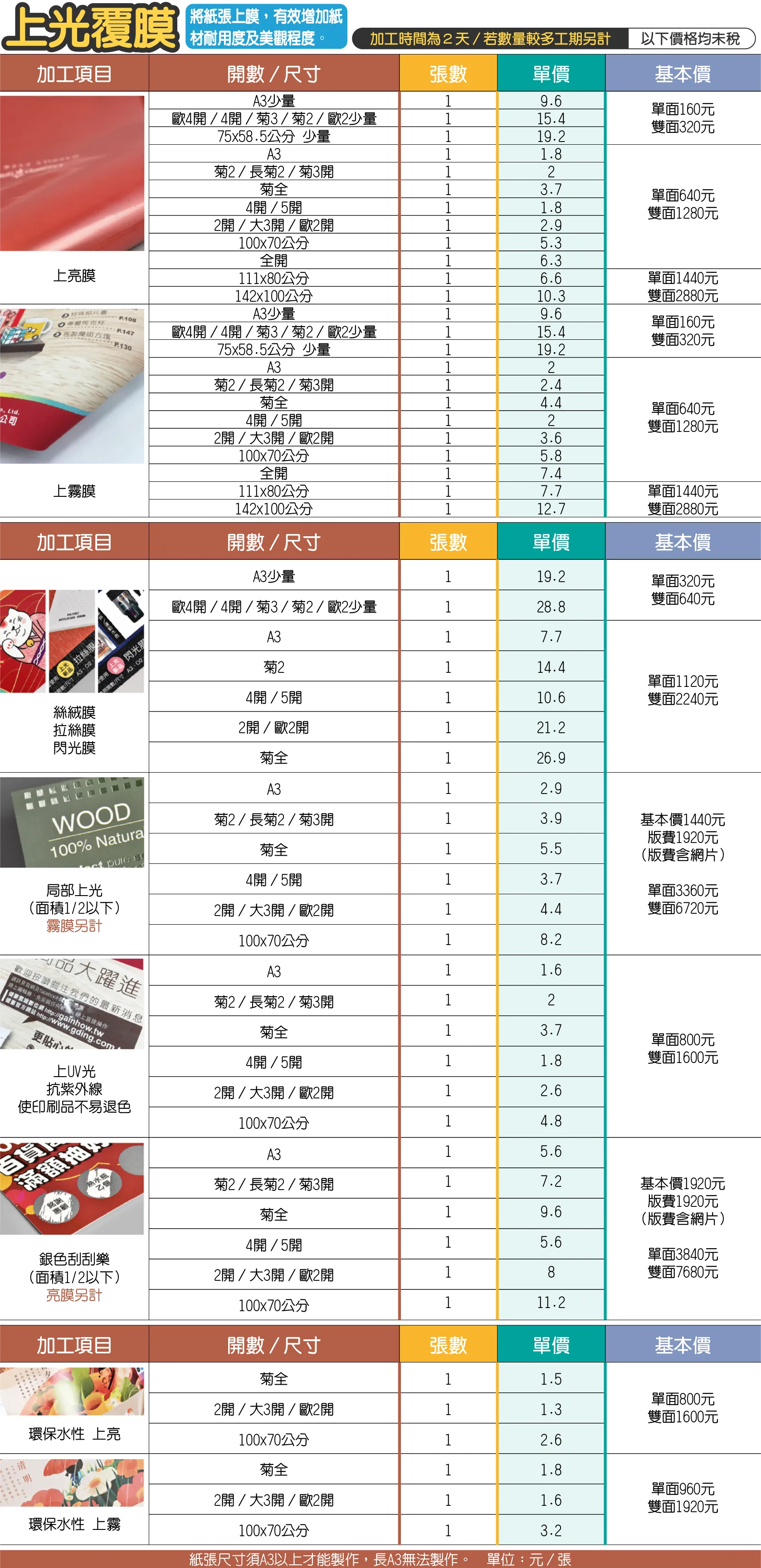 - 如需雙面上光,價格以2倍計價。
