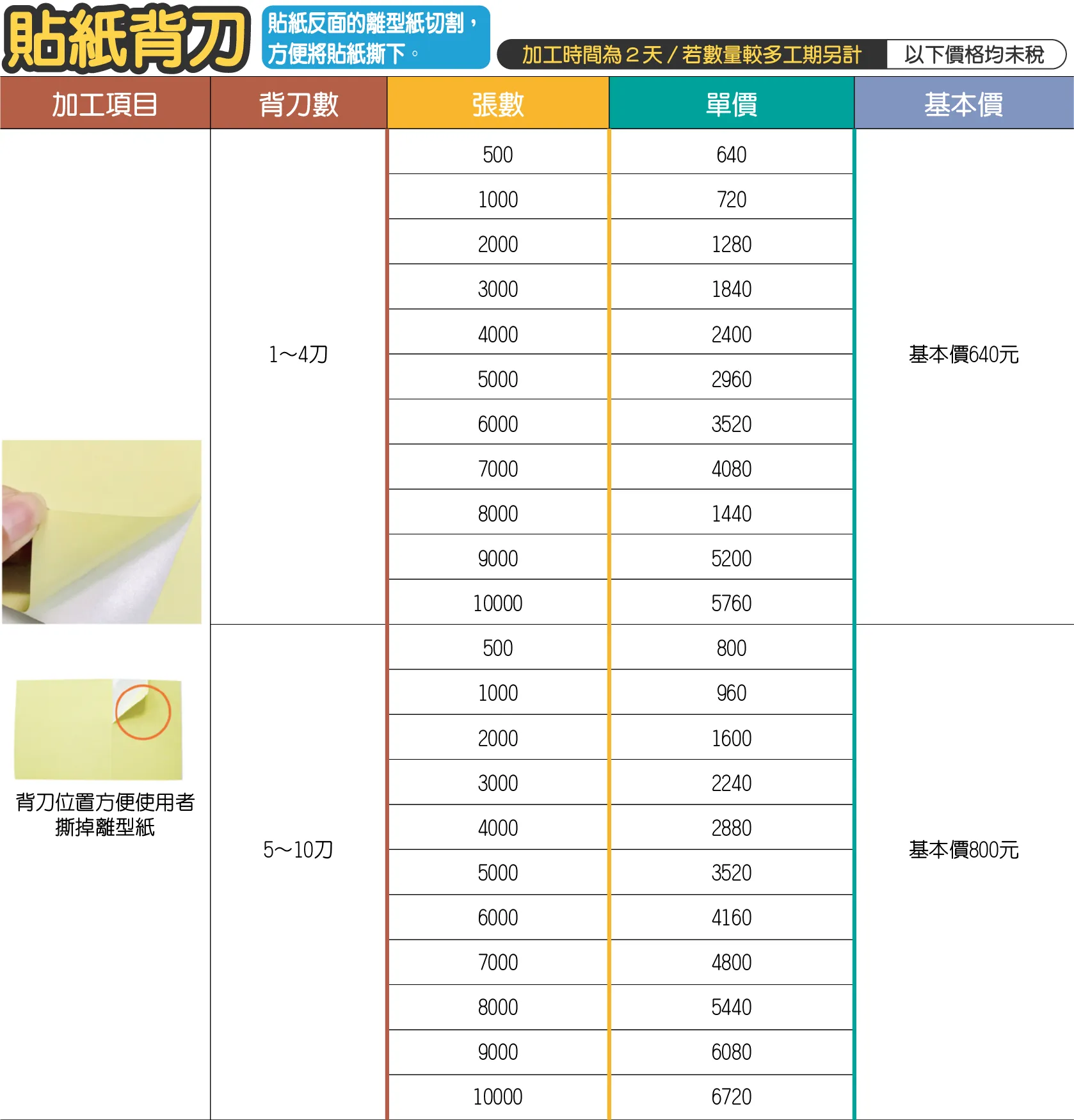 - 刀模一律由本公司保管,若自備刀模非一般木頭刀,其他刀款軋型費用需另外報價,且工期天數另計。