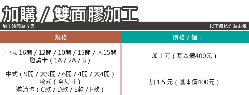 單面上光:摺紙項目單價乘上1.2倍