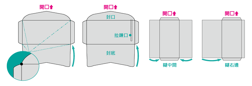 - 中式、歐式信封的開口出血,請直接填成方形色塊即可,不需要做成斜角,以免露白。
