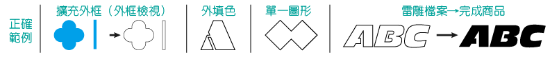 - 雷雕刀模檔若有作文字需建立外框,變形效果須擴充外觀,避免機器判讀錯誤(如下圖)。