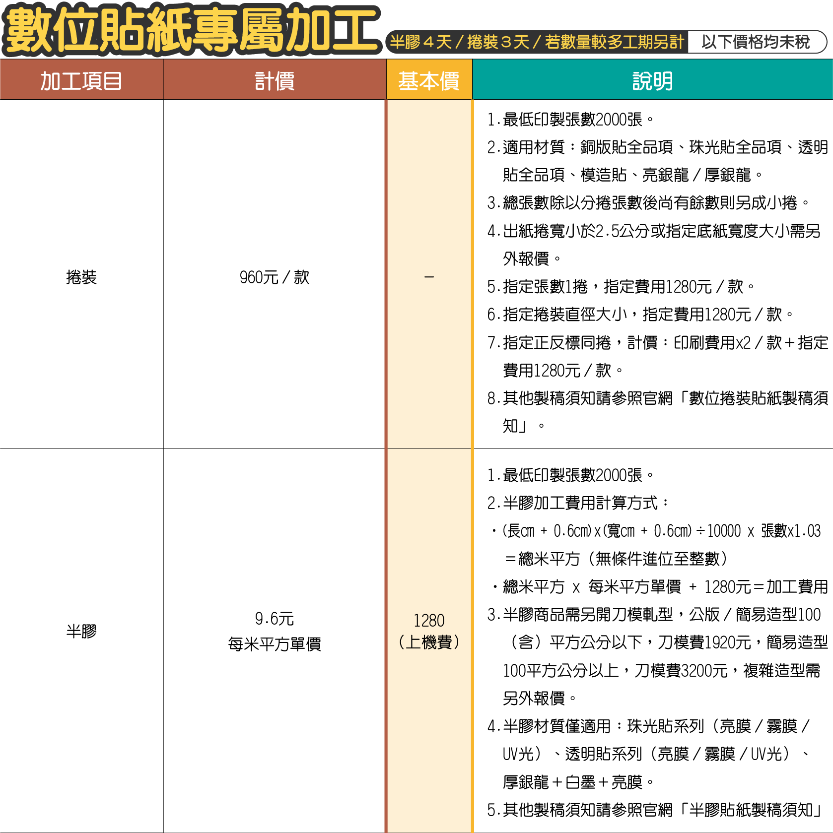 - 加工價格不足基本價時,將以基本價計算。