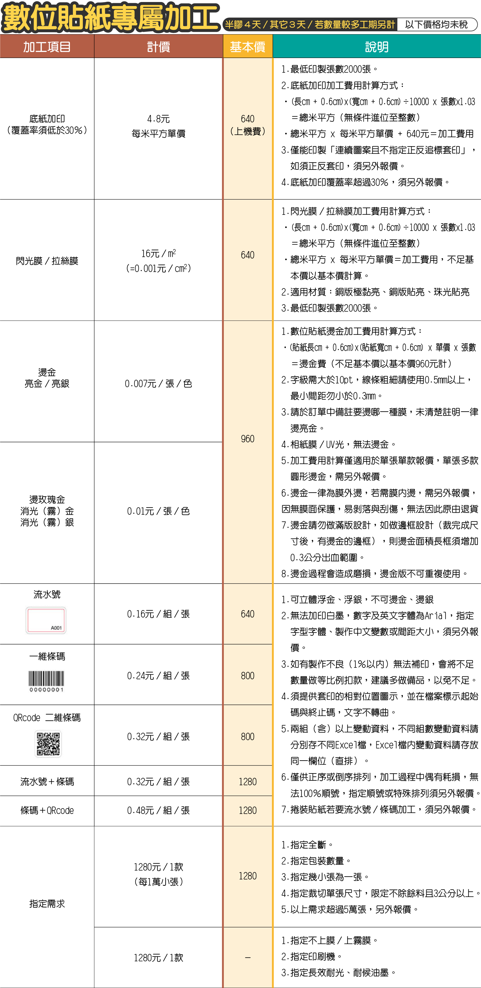 - 上光後(亮面霧面等)的商品如需燙金加工時,依價目表乘以1.3倍計算,基本價為500元。
