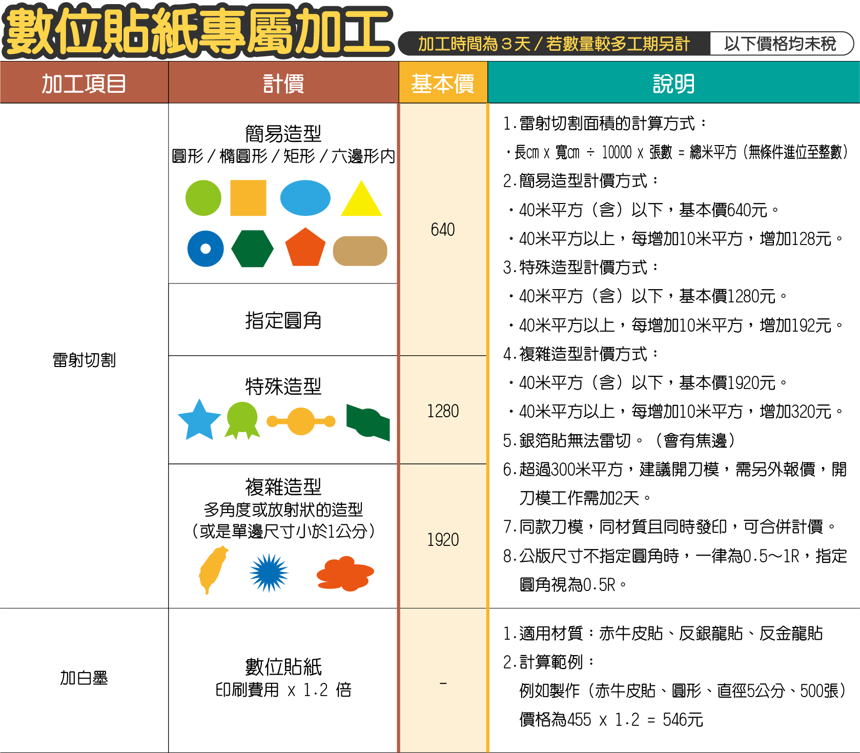 - 雷射切割特殊造型款計算:特殊造型款40米平方(含)以下,不足基本價以基本價1280元計價。