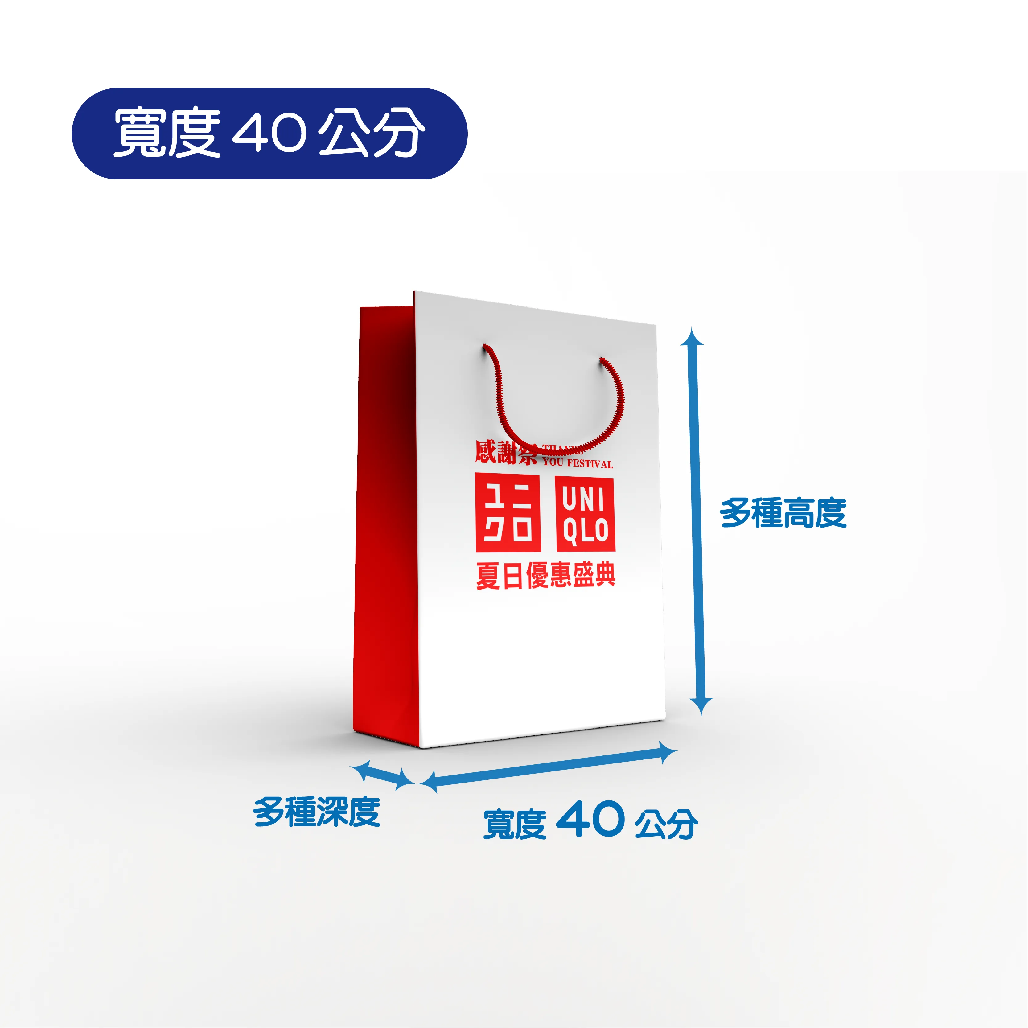 - 棉繩長度為 30 公分,若要改為 60 公分(可肩背),每個手提袋加收 6 元。